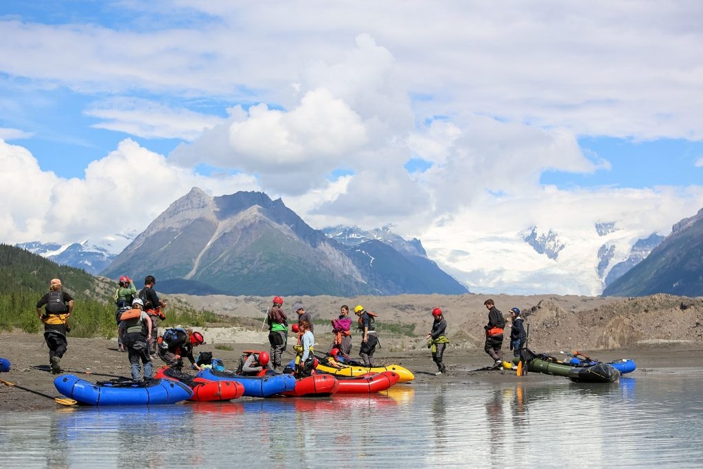 While in the park, the students also try pack rafting. This involves carrying an individual inflatable raft in a backpack that can be pulled out when reaching just the right spot. This allows rafting in areas without boat launch points. Rustic students pack raft in a pool at the foot of a glacier, cruising around ice chunks in the water.